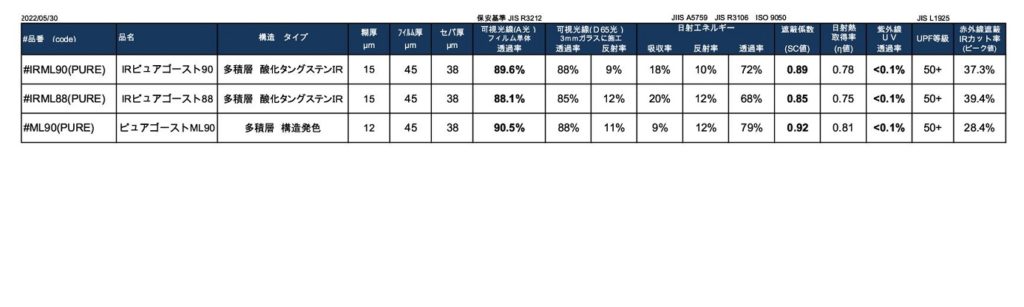 フィルムメーカー様からの供給品はメーカー公表値とさせていただきます。